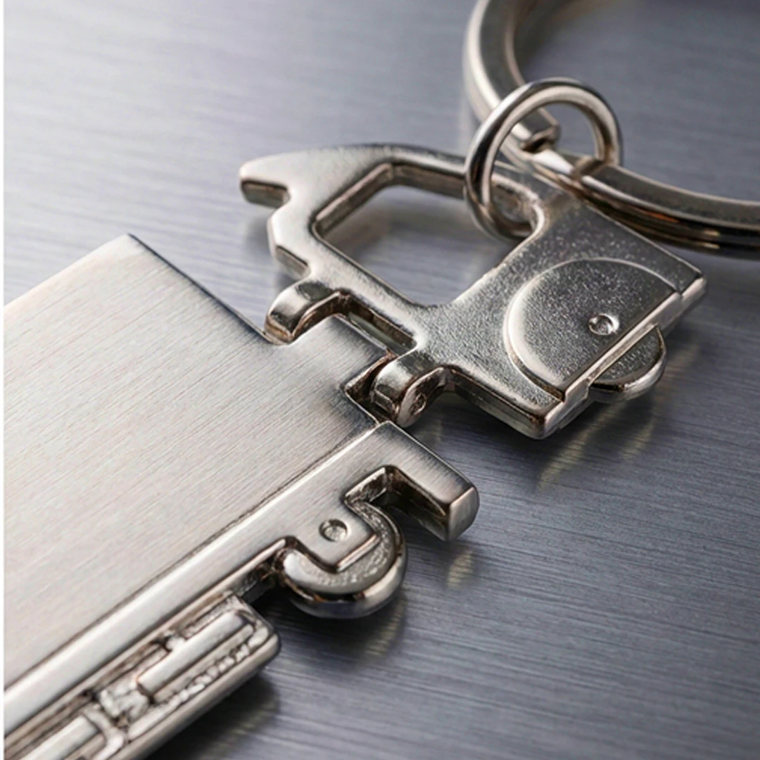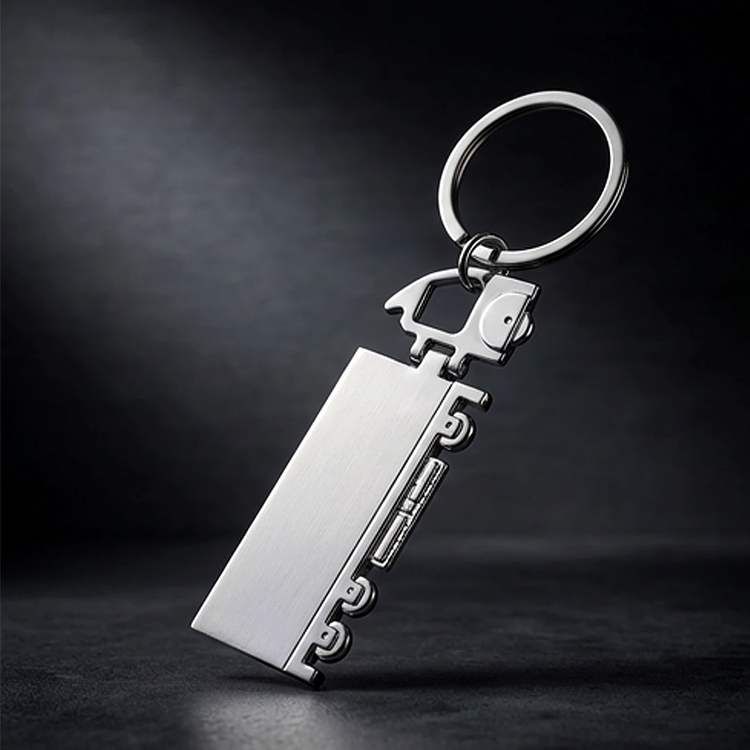 Metalni privjesak za ključeve dizajniran u obliku kamiona, s rotirajućim prednjim dijelom koji mu dodaje funkcionalnost i vizualnu zanimljivost. Predstavlja originalan dar za ljubitelje automobilske tematike, kao i praktičan promotivni proizvod za stručnjake iz područja transporta i logistike. Privjesak za ključeve isporučuje se pakiran u poklon omotnici.