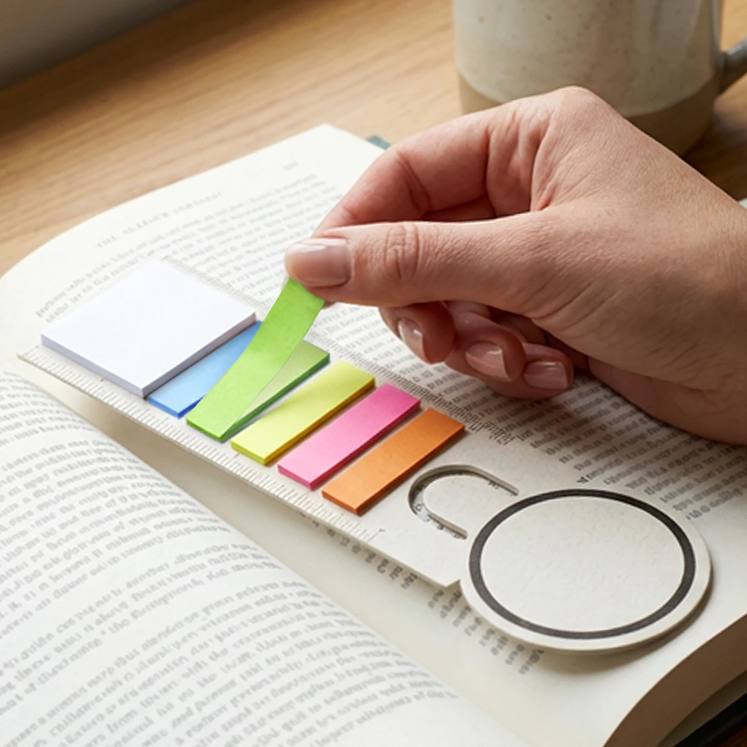 Knjižni označivač s dodatnim funkcijama, dizajniran za jednostavnu organizaciju i brzo označavanje važnih informacija u knjigama, planерима i dokumentima. Uz funkciju označavanja, uključuje ravnalo od 13 cm i samoljepljive papiriće u raznim formatima i bojama, što ga čini prikladnim za školu, ured i promotivne kampanje.